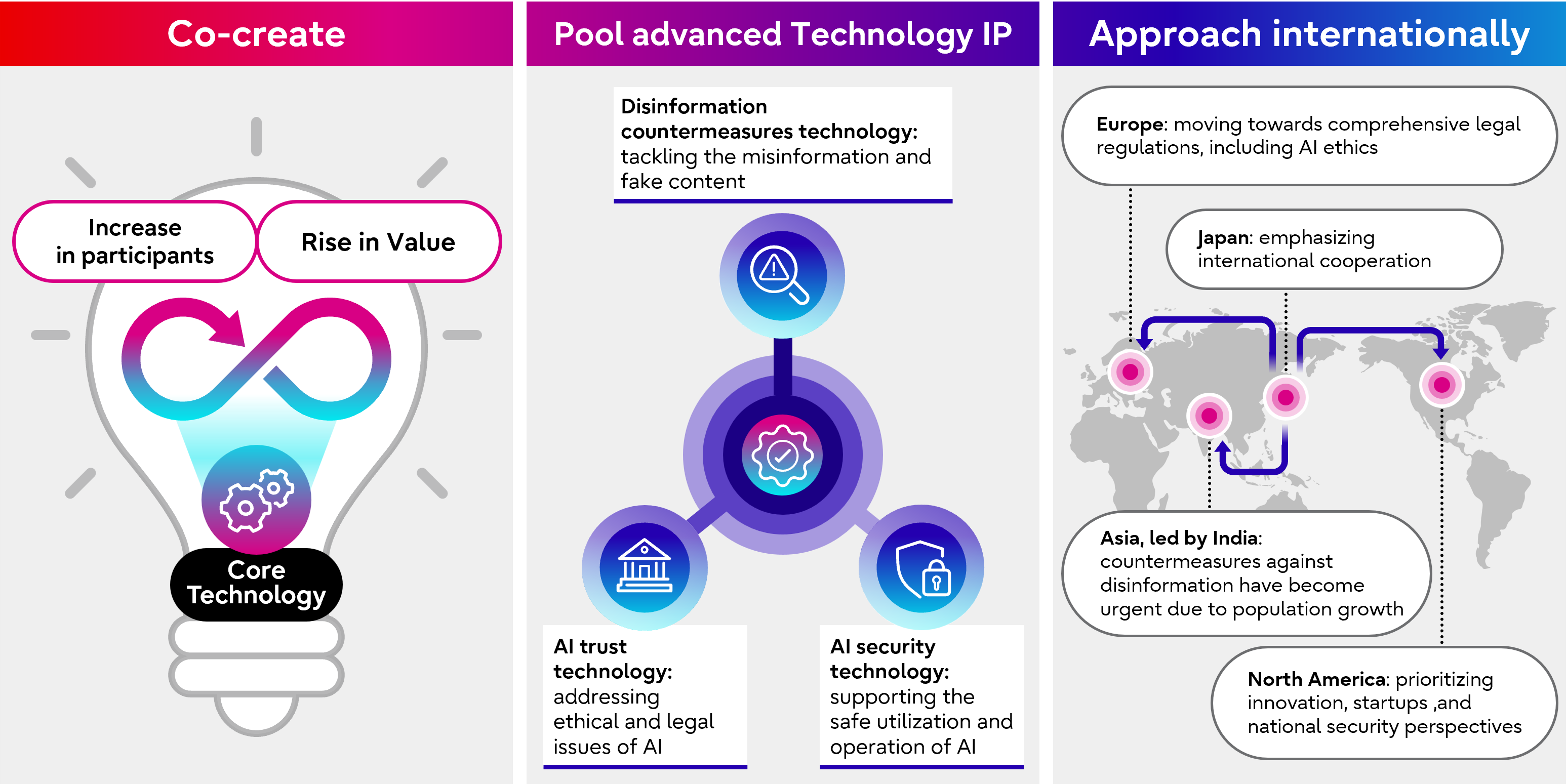 Frontria aims to rapidly create concrete applications and services, and by quickly sharing information about their use cases, it will seek to promote the adoption of technological IP that enhances the reliability and safety of AI technology and counters misinformation. In fiscal year 2025, the consortium will commence activities with participating organizations from Japan, Europe, North America, India, Australia, and other regions. It will engage with organizations across diverse industries worldwide to expand the consortium's scale and create new use cases in sectors such as finance, insurance, media, entertainment, legal, and AI businesses. By the end of fiscal year 2026, the consortium aims to have over 100 global participating organizations, generating multiple IP business cases.