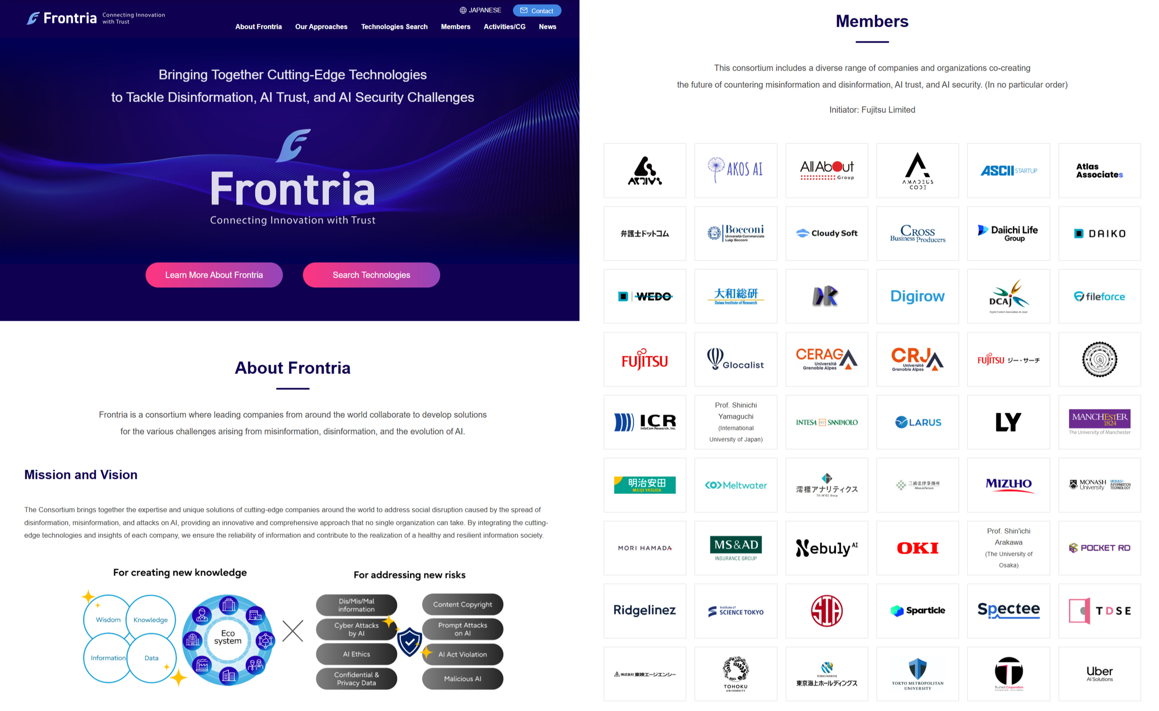 While generative AI offers profound benefits, it also presents significant risks: the spread of disinformation, AI system vulnerabilities, and the urgent need for regulatory compliance (e.g., EU AI Act) [1]. With disinformation alone causing an estimated 12.2 trillion yen in economic losses in 2023 [2], and businesses facing financial risks from non-compliance and cyberattacks, these complex issues demand a collaborative, multi-sector approach. Frontria will address these by focusing on disinformation countermeasures, AI trustworthiness and security, driving technological advancement through industry insights and fostering innovative applications and business models.