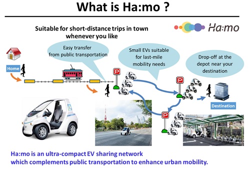 Ha:mo is a car sharing system that utilizes ultra-compact EVs suitable for short-distance travel and allows one-way usage. The system was launched in Toyota City in 2012 and has been implemented in environments such as major cities, tourist spots, and provincial towns. These include Tokyo, Okinawa, Okayama, and Grenoble in France. It seeks to realize comfortable travel and an environmentally friendly mobility society by providing a mode of last-mile transportation between public transportation and destinations.