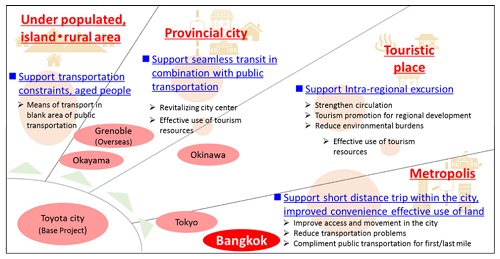 As a joint project commemorating TMT's 55th anniversary and Chulalongkorn University's 100th anniversary, a decision was reached to implement the service within Chulalongkorn University's campus in Bangkok to explore ways to solve traffic issues, such as traffic congestion and air pollution, in major cities of emerging countries. This project is being carried out as a case model for other emerging countries.