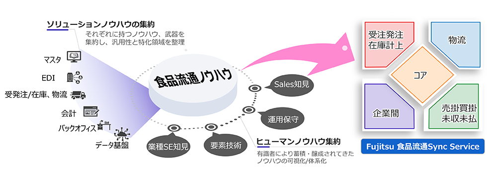 食品流通業界においては、業務の根幹となる大規模基幹システムを企業ごとに抱え、導入作業や運用における負荷が高く、IT人材不足も課題となっており、業界全体で、業界共通の業務プロセスやシステムなどの非競争領域における標準化や効率化が求められています。当社は、本業界において長年に渡り多数のシステム構築実績があり、これまでの基幹システム開発で蓄積した業界に対する知見とノウハウを「Fujitsu 食品流通 Sync Service」として集約し、共通化、標準化できる機能を体系化しました。