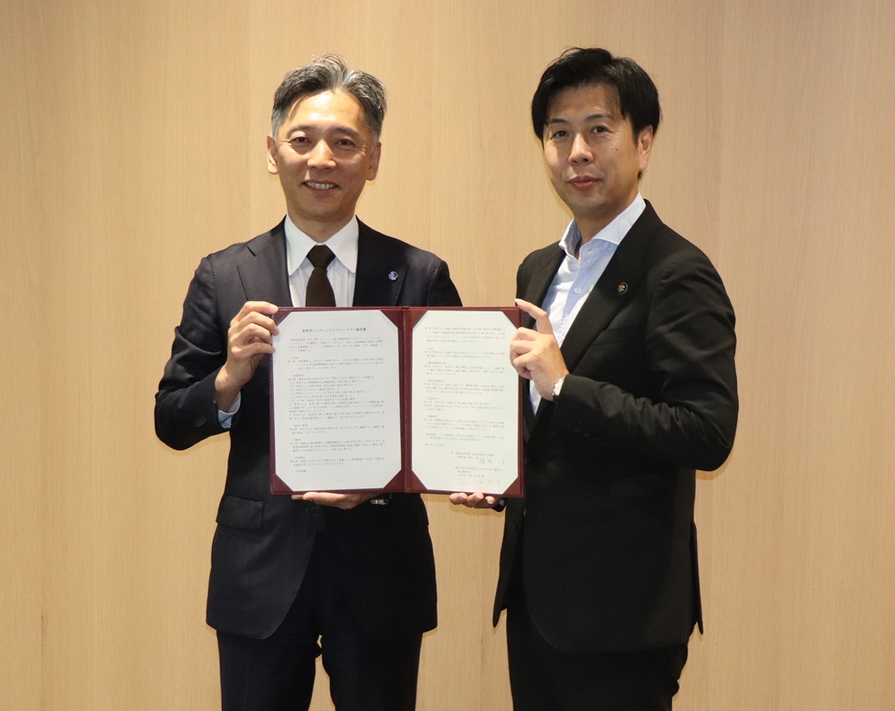 Photo of Issei Shinohara, Mayor of Iki City (right) and Keiichiro Nishi, SVP Head of CEO office, Fujitsu Limited (left) signing ceremony