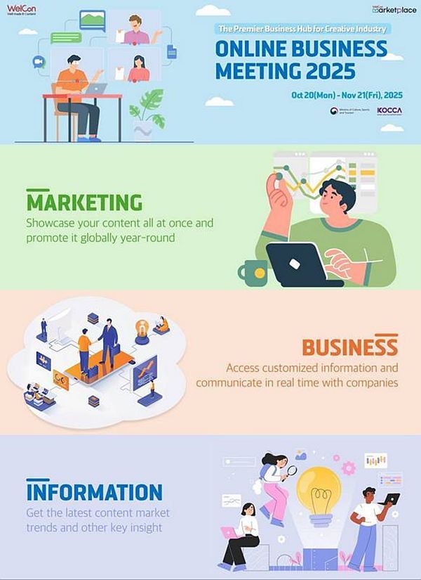 The ongoing 'WelCon Marketplace Virtual Business Consultation' is a representative online exchange program connecting Korean content companies with overseas buyers. The consultation sessions focus on practical collaboration discussions in areas such as â‘  co-production, â‘¡ investment, and â‘¢ distribution and licensing, with more specialized business matching facilitated through genre-focused weeks (animation, character, broadcasting, game, new technology, and webtoon).