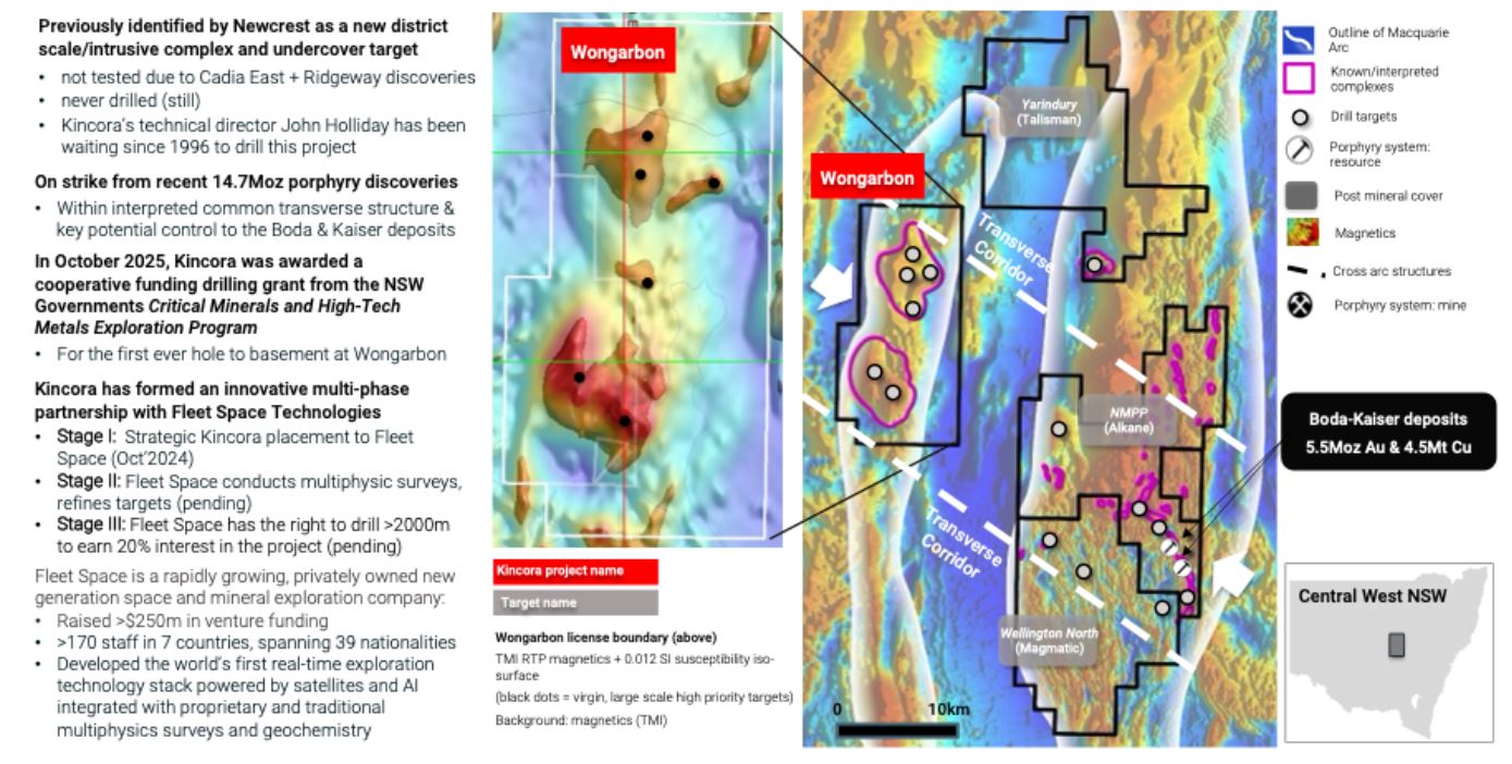 Melbourne, Australia--(ACN Newswire - November 18, 2025) - Gold-copper explorer and hybrid project generator Kincora Copper Limited (ASX: KCC) (TSXV: KCC) ("Kincora" or "the Company") is pleased to have commenced drilling at the Wongarbon porphyry project designed to provide the first ever sample of basement geology and test a prominent magnetic anomaly analogous to the anomalies associated with the largest greenfield discoveries in the Macquarie Arc in recent decades.