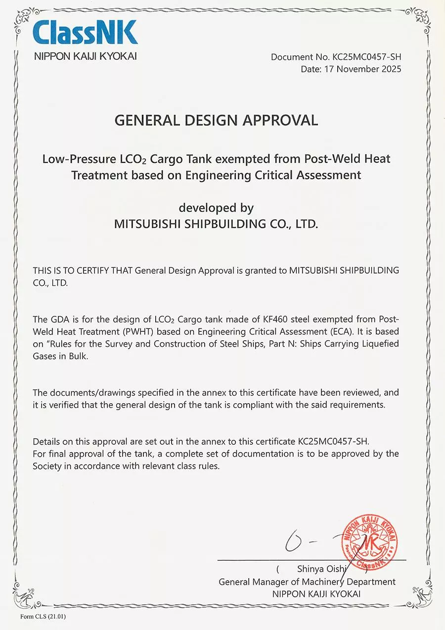 TOKYO, Dec 5, 2025 - (JCN Newswire) - Mitsubishi Shipbuilding Co., Ltd. (Mitsubishi Shipbuilding), a part of Mitsubishi Heavy Industries (MHI) Group, and Nippon Steel Corporation (Nippon Steel) have applied Nippon Steel's developed steel to the cargo tanks of low-pressure liquified CO2 (LCO2) carriers and have jointly developed the PWHT(*1)-exemption technology based on ECA(*2). Both companies have recently received the world's first General Design Approval (GDA)(*3) from Nippon Kaiji Kyokai (ClassNK) for this technology.