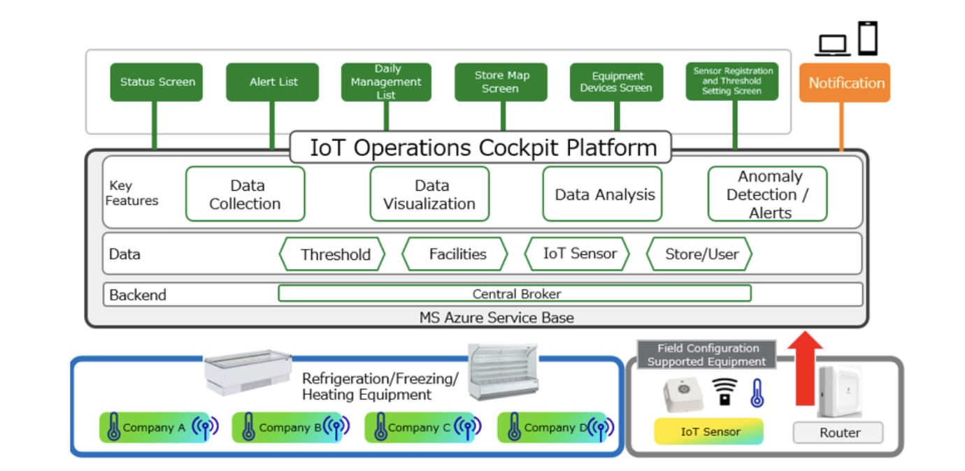 At Beisia, IoT sensors attached to refrigeration and freezing equipment throughout the stores will extract and visualize temperature information in real-time. This eliminates the need for manual inspection and recording by store employees, significantly reducing their workload.