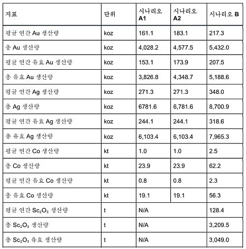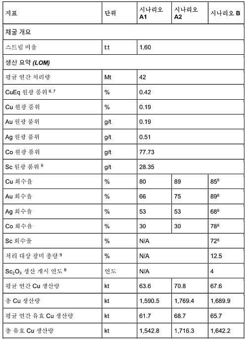 2026년 3월 2일 보도자료 발표 이후, PEA를 담당한 독립 엔지니어링 업체인 Mineit Consulting Inc.는 Scenario B에서 스칸듐 회수 공정과 관련된 특정 처리 비용 가정의 적용에 대해 추가 검토를 완료하였습니다. 해당 검토 결과, 합의 금속 가격 기준 Scenario B의 세후 NPV(5%)는 C$69.4억에서 C$72.7억으로 상향 조정되었으며, IRR은 19%입니다. 또한, 현물 금속 가격 기준 Scenario B의 세후 NPV(5%)는 C$145.2억에서 C$148.5억으로 증가하였으며, IRR은 32%입니다.