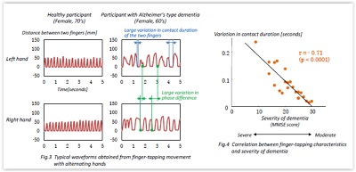 NCGG measured the finger-tapping movement in a group of 23 participants diagnosed with pre- or developed Alzheimer's-type dementia and a group of 22 healthy aged participants, and found a high correlation with MMSE(4) scores, a common medical questionnaires for dementia screening, also conducted on the 2 groups. A significant difference was found between the dementia and healthy groups when the finger-tapping movement (Figure 1) was conducted alternately between the two hands (Figure 3). No relationship was found between the dementia and measurement of finger-tapping movement of one hand only. The high correlation with MMSE scores was identified for two characteristics: (a) the variation in phase difference(5) when the finger-tapping movement is performed simultaneously by both hands (r(6) = -0.78), and (b) the variation in duration of contact between the index finger and the thumb when the tapping movement is performed alternately between the right and left hand (r = -0.71, Figure 4). It is believed that the measurement results captured the deterioration in the ability to coordinate rhythmical movement in both hands resulting from the atrophy of the corpus callosum(7) and basal ganglia(8) due Alzheimer's-type dementia.
