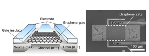 This development paves the way for compact instruments that can measure specific gas components with speed and sensitivity, for detecting atmospheric pollution or testing for organically derived gases in a person's breath. Fujitsu Laboratories has developed a gas sensor that operates on a new principle, in which the gate part of a silicon transistor is replaced by graphene. This sensor can detect concentrations lower than tens of parts per billion (ppb) of nitrogen dioxide (NO2) and ammonia (NH3); with nitrogen dioxide in particular, sensitivity has improved more than tenfold, to less than 1 ppb. This technology is expected to enable real-time measurements of air quality, which may have taken tens of hours depending upon the gas being measured. It will also simplify detection of gas components in breath, which can be used to quickly discover lifestyle diseases. Details of this technology are to be presented at the 2016 IEEE International Electron Devices Meeting, which opened December 3 in San Francisco. Background
