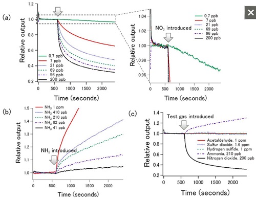 http://www.acnnewswire.com/topimg/Low_FujitsuGas1252.jpg Figure 2: The newly developed graphene gate sensor, a schematic (left), and a scanning electron microscope image (right) of the produced sensor A sensor based on this principle has been created that measures a few tens of ppb of ammonia and less than 1 ppb of NO2 in a nitrogen environment. Among the gases expected to be found in analyses of the air or human breath, the results of tests have demonstrated that it reacts only to NO2 and NH3, meaning that it can detect only specific gases (Figure 3). http://www.acnnewswire.com/topimg/Low_FujitsuGas1253.jpg Figure 3 a: Responsiveness of graphene-gate sensor's output to NO2, left: a magnified figure b: Responsiveness to ammonia c: Responsiveness to various gases This technology's sensitivity to NO2 is an order of magnitude greater than conventional resistivity-based graphene sensors, at less than 1 ppb, and the commercially available electrochemical sensors, which have sensitivity of over tens of ppb. Results