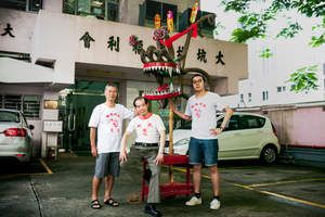 Japanese caption:(左から)Pang Man-kanさん、Chan Tak-faiさん、Alan Fok Chun-fungさんは大坑舞火龍を未来につなごうと心に決めています。