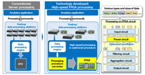 TOKYO, Nov 15, 2017 - (JCN Newswire) - Hitachi, Ltd. (TSE: 6501) today announced the development of the technology increasing the speed of big data analytics on an open source software Hadoop-based distributed data processing platform(1) (Hadoop platform) by a maximum of 100 times that of a conventional system. This technology converts data processing procedure generated for software processing in conventional Hadoop data processing, to that optimized for parallel processing on hardware, to enable high-speed processing of various types of data in FPGA(2). As a result, less number of servers will be needed when conducting high-speed big data analytics, thus minimizing IT investment while enabling interactive analytics by data scientists, quick on-site business decision making, and other timely information services. This technology will be applied to areas such as finance and communication, and through verification tests, will be used to support a platform for data analytics service.