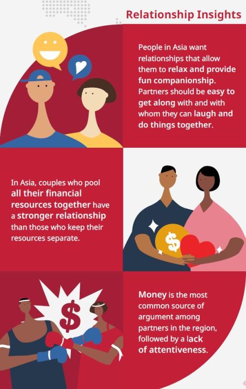 What is the key to relationship success in Asia? In Asia, people most desire a partner who is "easy to get along with", by which they mean someone who allows them to relax and is fun to be around. Given the pressures of daily life, they are likely to seek a companion who makes them laugh and enjoy doing things together.