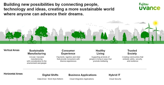 Fujitsu Uvance will play a central role in driving the growth of Fujitsu's core business, comprising seven key focus areas. Four of these consist of cross industry vertical business areas, which relate to the ideal state of the world and possible social issues confronting us in the present as well as in the future: "Sustainable Manufacturing," "Consumer Experience," "Healthy Living," and "Trusted Society". Supporting these vertical areas, and forming a platform for the collection of data, creating synergies between applications and performing analysis are the three horizontals: "Digital Shifts," "Business Applications," and "Hybrid IT".