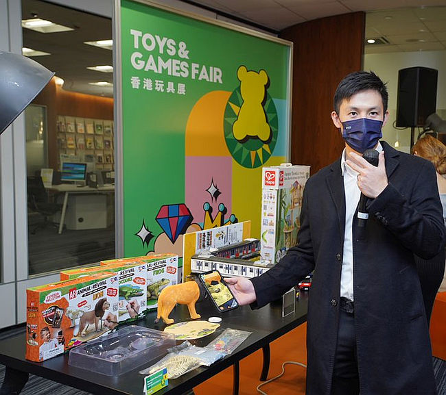 | | Exhibitors at the Toys & Games Fair displays an AR Animal Revival - Lion toy. By scanning the link on the lion's body, it shows a lion in vivid detail, enabling children to learn about the animal's habits and habitat and capture a photo with the lion by smartphone. |